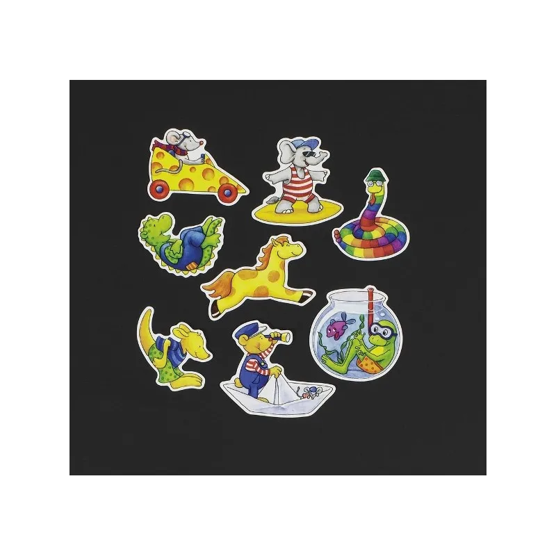 Série de 8 motifs avec des animaux prédécoupés sur une planche magnétique. Votre enfant pourra les disposer sur un tableau, mais aussi sur le frigo pendant que Papa et Maman préparent le repas.