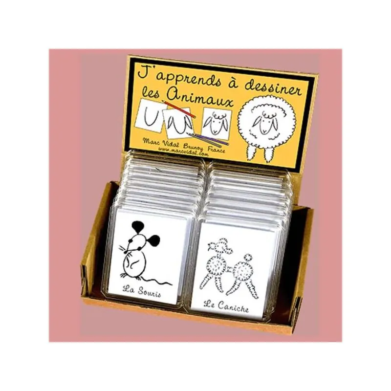 Boîte contenant 18 modèles d’animaux à dessiner en suivant les étapes indiquées au dos de chaque carte. Des cartes que les enfants pourront ensuite garder pour reproduire ces animaux drôles et familiers sur leurs dessins.