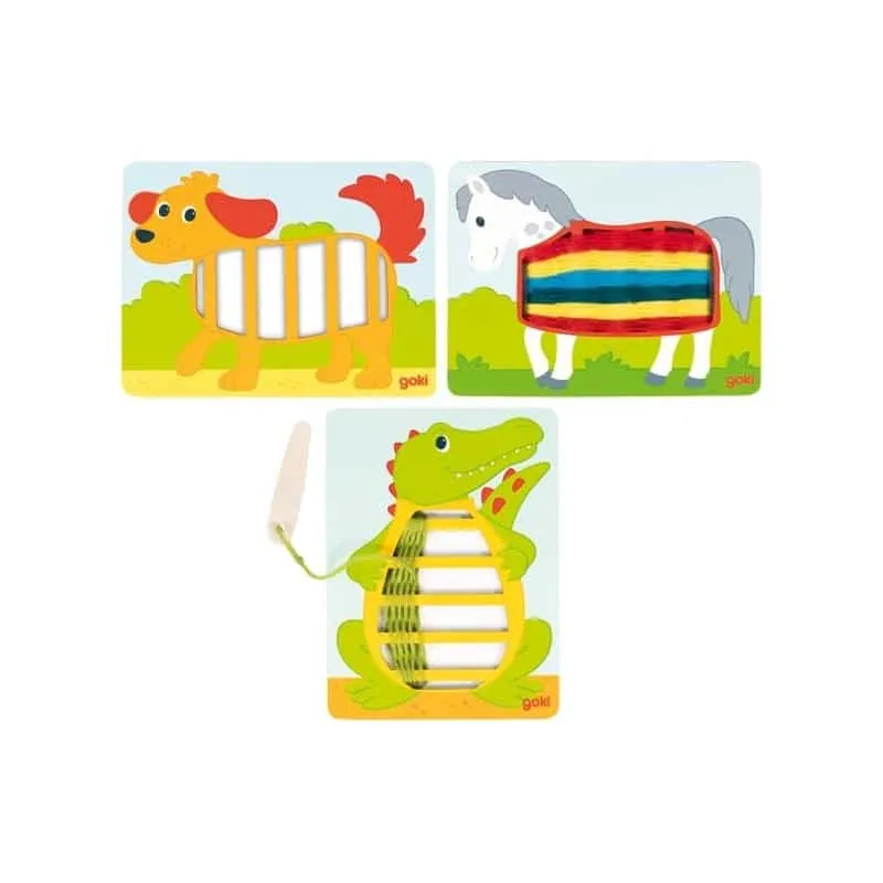 Set créatif comprenant 3 animaux à tisser : Crocodile, chien et cheval en bois à tisser et 7 couleurs de laine.
