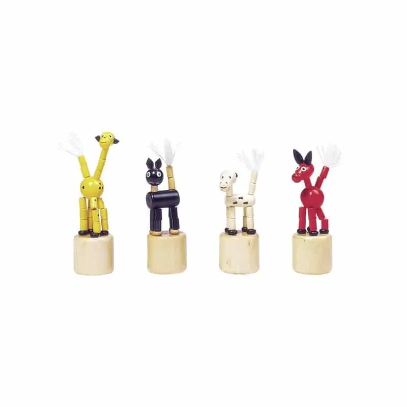 En appuyant sous leur socle, ces marionnettes en bois se désarticulent de manière surprenante, s’effondrant de manière comique avant de se redresser fièrement lorsque la pression est relâchée. Ce mécanisme simple mais ingénieux captive les enfants, qui s’amuseront à répéter l’opération encore et encore.