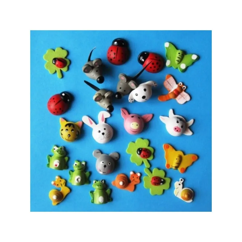 L’assortiment comprend 15 modèles différents : coccinelles sur trèfle, coccinelles, souris escargots, grenouilles, papillons, libellule, cochon, vache, chien, chat, lapin.Dimension environ 2 cm.