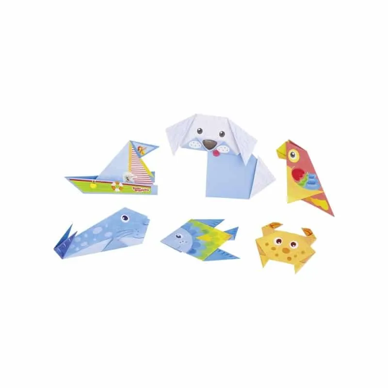 Kit origami comprenant 14 feuilles multicolores et 2 planches de stickers et un livret avec l’explication des pliages en image. Set pour s’initier au pliage japonais et réaliser : poissons, chien, perroquet, crabe et un voilier.