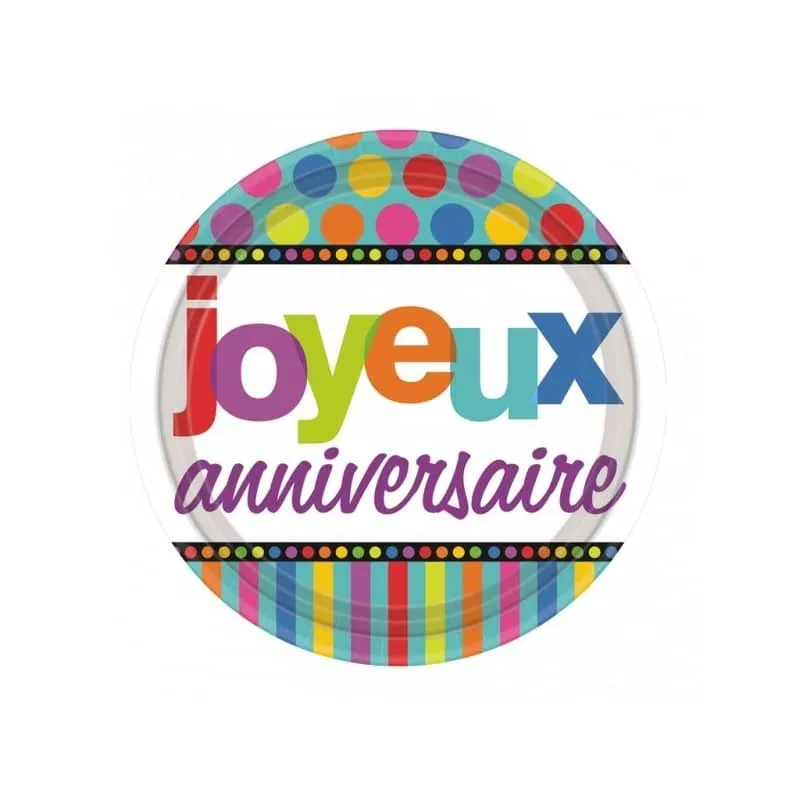 Paquet de 8 assiettes avec en gros écrit Joyeux Anniversaire. Pois et rayures encadrent le texte. Vaisselle en carton jetable pour un anniversaire festif. Collection Rio.