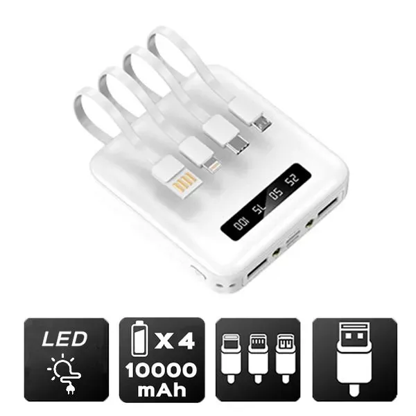 Cette Batterie avec câble 4 en 1, possède une puissance de 10000mAh qui vous permettras de jamais tomber en panne , elle a aussi 2 ports USB en recharge rapide de 2.1A. Cette batterie et complétement universelle grâce à son câble 4 en 1 qui lui permet de convenir à tous. C’est un produit qualitatif, durable et pouvant être utilisé par tous. 2 lampes torches sont aussi intégrées à l’avant de la batterie qui la complète. Cette batterie pratique, élégante et complète vous permettras une grande autonomie, et en plus elle est universelle.