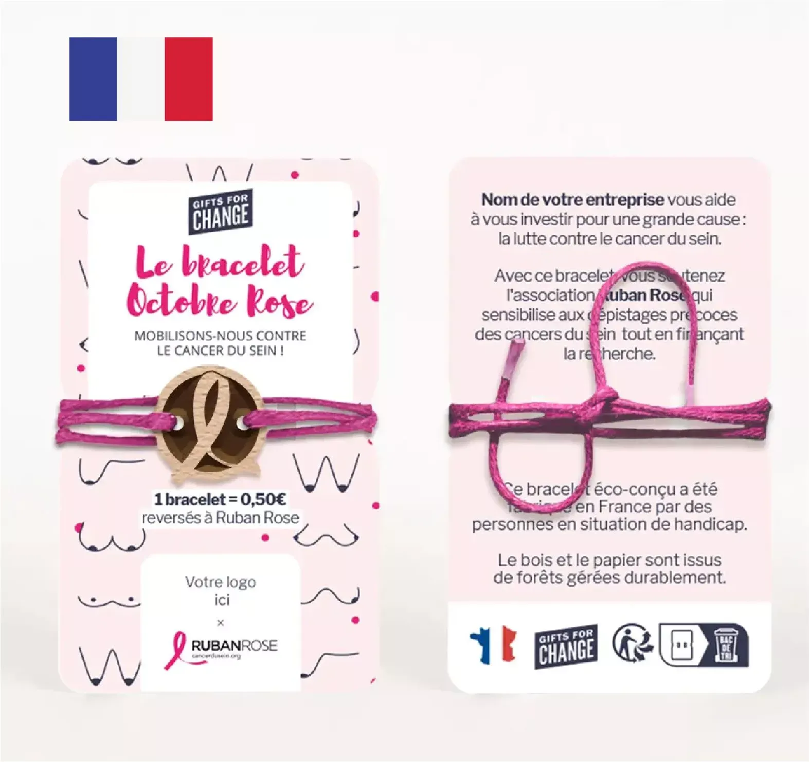 Choisissez votre design, la cause que vous souhaitez soutenir, déterminez le montant à reverser par bracelet brochable made in France et rassemblez vos partenaires autour de ce symbole solidaire, démontrant votre engagement commun !