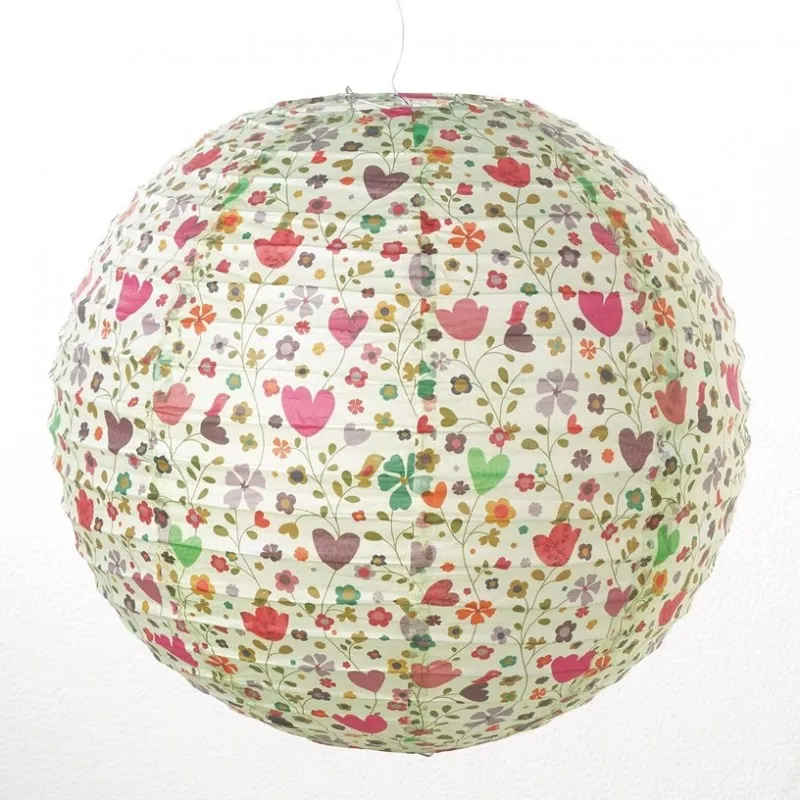 Lampion en papier avec sur un fond blanc des fleurs, et des coeurs pour une ambiance champêtre.