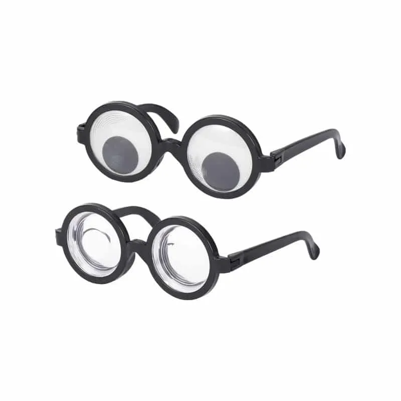 Lot de 2 paires de lunettes. L’une avec yeux grossissants, et l’autre avec des yeux gigoteurs. Accessoire pour un déguisement et faire des gags.