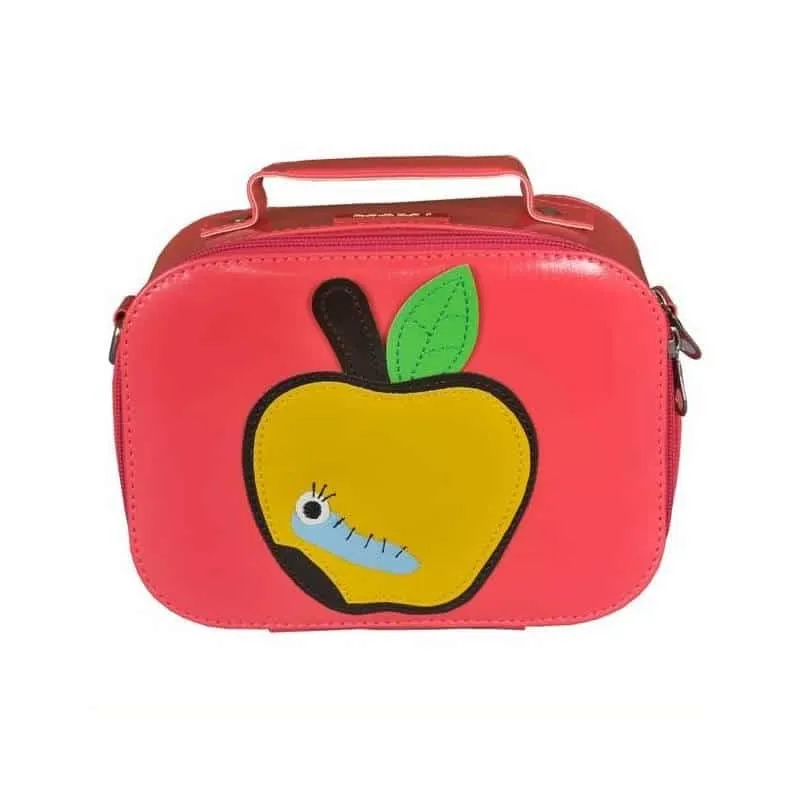 Pour transporter des bricoles ou son goûter cette mini-valise se porte à la main ou à l’épaule. Comme elle est en vinyle un coup d’éponge et elle sera toujours propre. Boîte à goûter rose vif décorée d’une pomme jaune avec pochette àl’intérieur. Marque Bakker made with love.