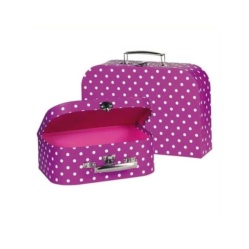 Une idée de cadeau qui fait toujours plaisir aux enfants. Valise pour ranger les habits de poupée, les petites voitures, ou faire semblant de partir en voyage. Lot de 2 valisettes en carton mauves à pois blancs.
