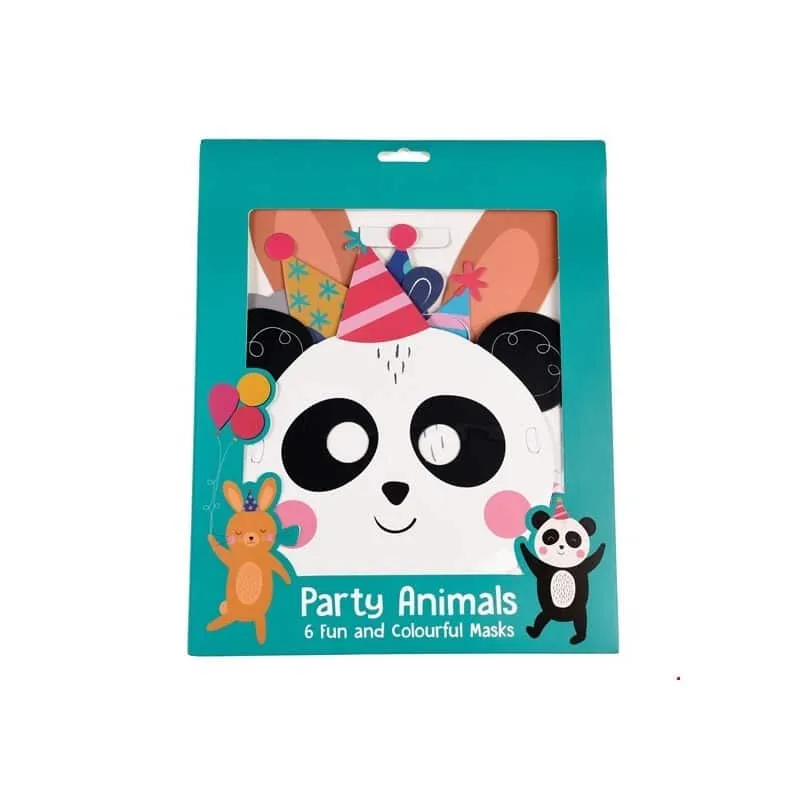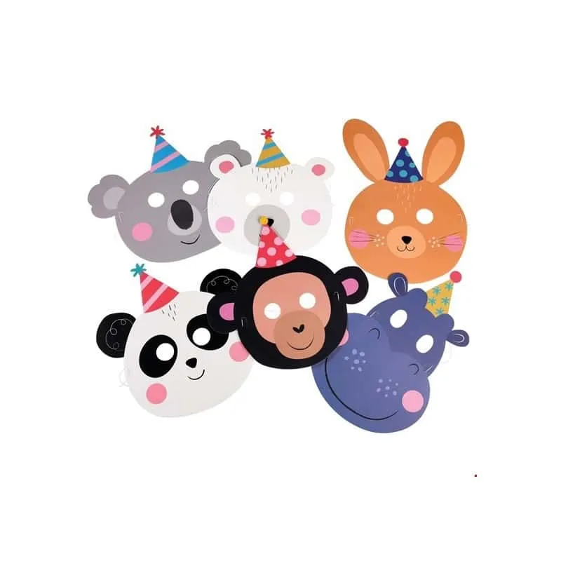 Masques en carton avec lapin, panda, rhinocéros, ours, singe et koala, tous portent un petit chapeau de fête pour souffler les bougies du gâteau tant attendu.