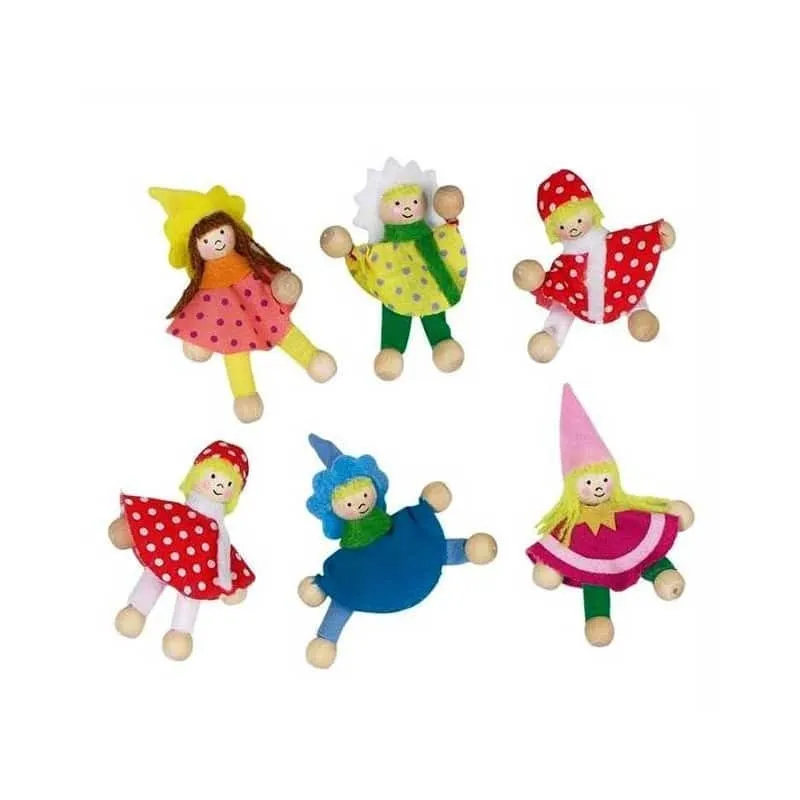 Petit scotch double face au dos de ces petites poupées en bois habillées en feutrine vendues par sachet de 6 pour loisirs créatifs de la marque Goki.Hauteur d’une poupée : 6 cm