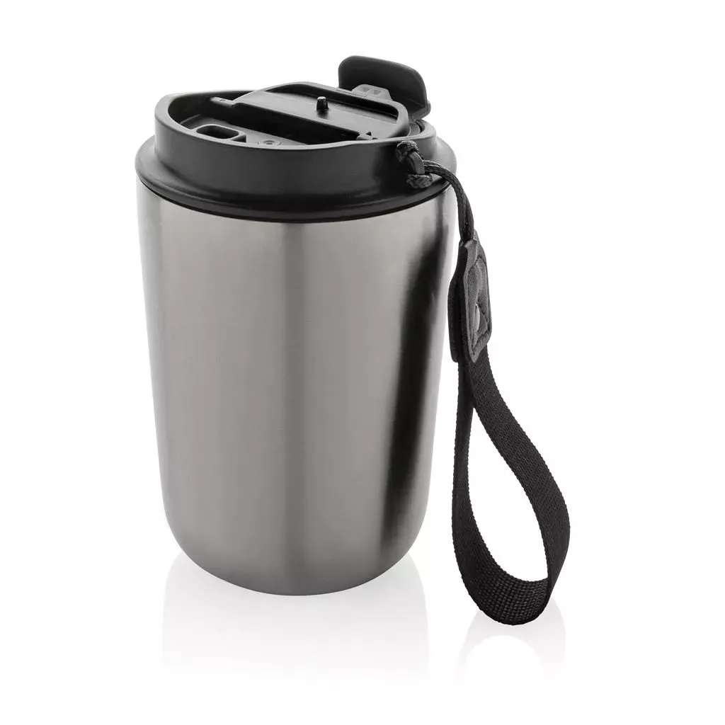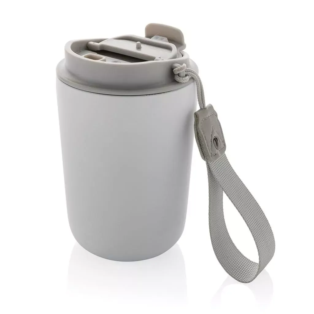 Mug isotherme en acier recyclé 380 ml, équipé d’un couvercle rabattable étanche. Idéal pour déguster vos boissons chaudes ou froides, que ce soit à l’intérieur ou à l’extérieur. Il est muni d’une lanière pratique pour faciliter le transport. Fabriqué avec des matériaux recyclés certifiés RCS, assurant une chaîne d’approvisionnement entièrement certifiée pour les matériaux recyclés.