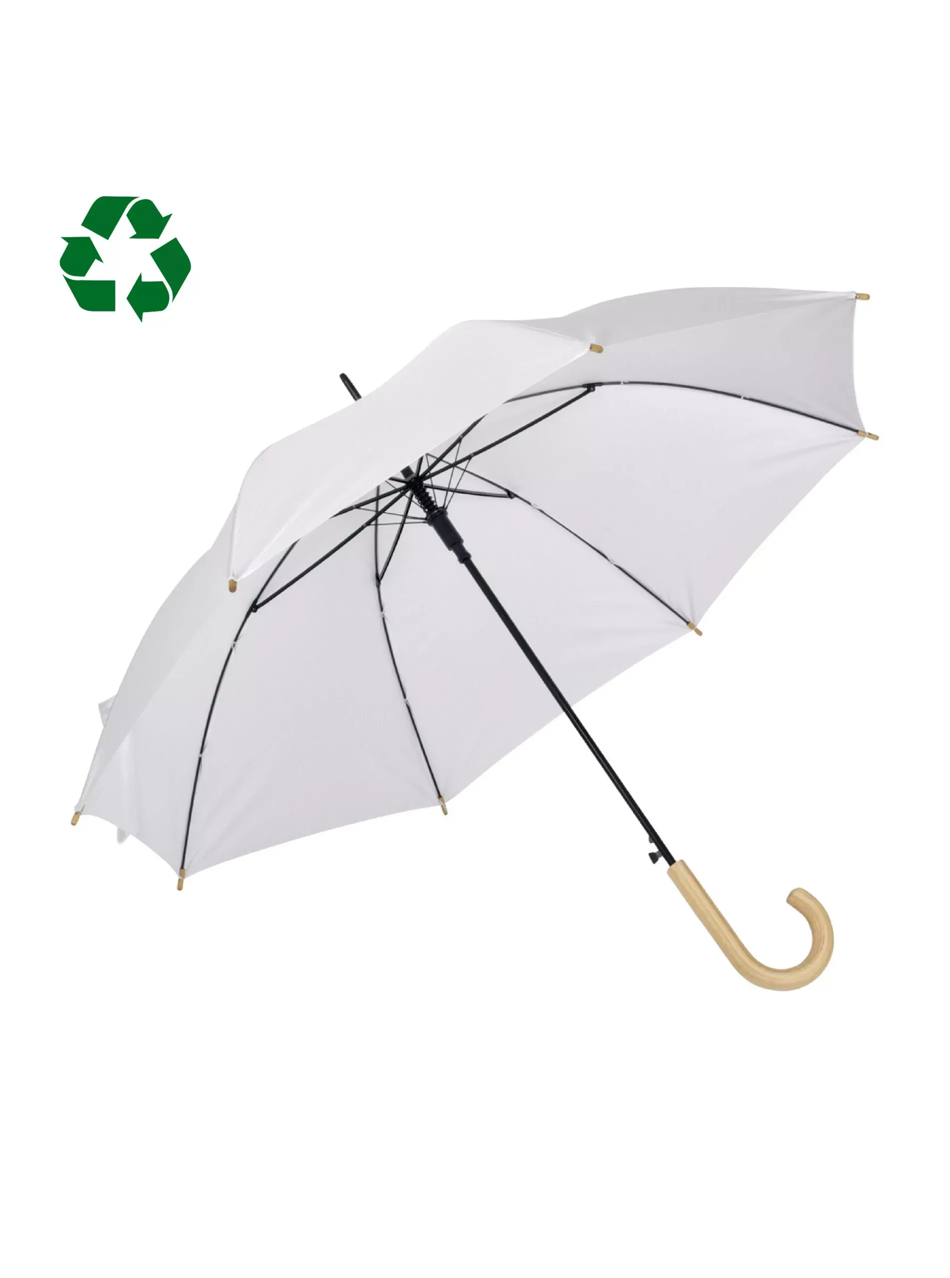 Ce parapluie à ouverture automatique contient un manche en métal, des baleines en fibres de verre, une poignée courbée ronde en bois, une toile en polyester pongée en matières recyclés ainsi qu’une fermeture velcro.