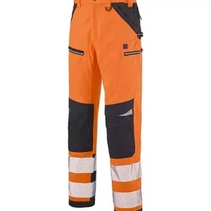 Parka haute visibilité multipoches avec bandes réfléchissantes et capuche repliable dans le cou.