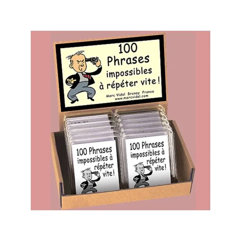 Un jeu que les enfants adorent. Pendant une fête d’anniversaire pour pimenter le jeu les enfants doivent répéter la phrase en sautant à la corde, fous rires assurés. Boîte contenant 100 phrases impossibles à répéter vite.