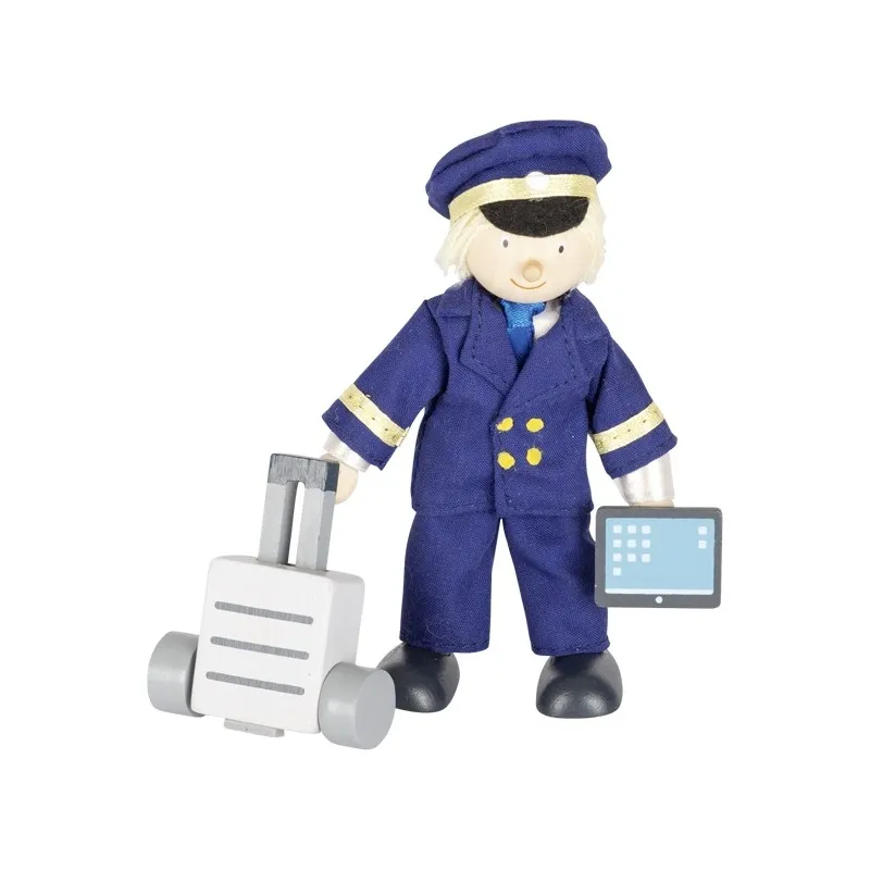 Pilote prêt à embarquer avec sa valise et ordinateur. Figurine en bois et coton pour garder de la flexibilité dans ses mouvements. Jouet de la marque Goki pour les enfants à partir de 3 ans