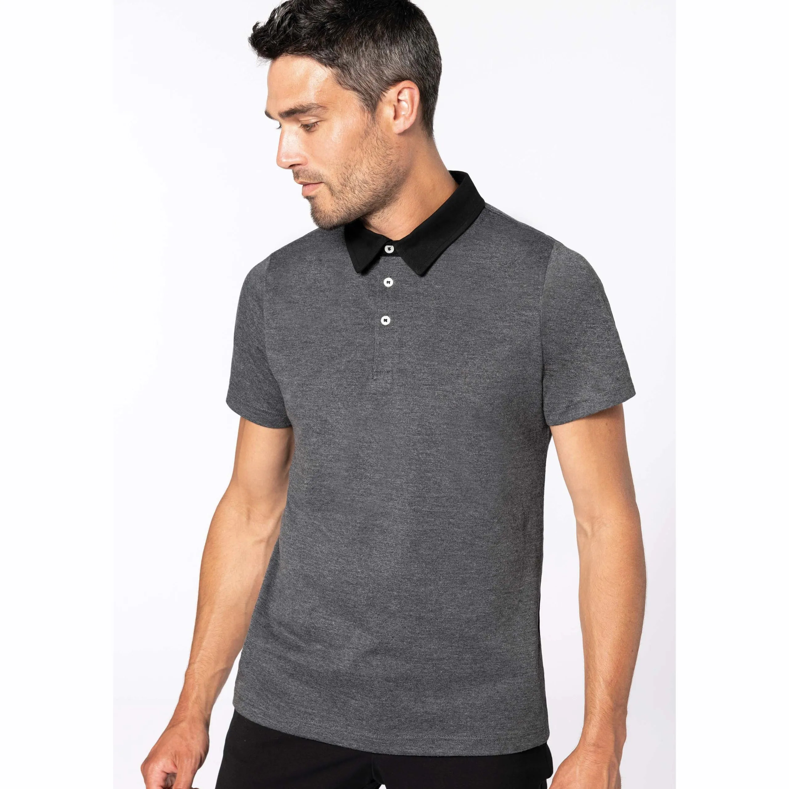 Polo jersey composé à 100% de coton, 65% polyester et 35% coton pour coloris chiné, 180 gr/m².