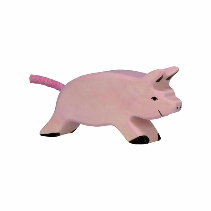 Petit cochon rose en train de courir, une figurine en bois massif. Jouet Holztiger fabriqué à la main et peint avec de la peinture à base d’eau.