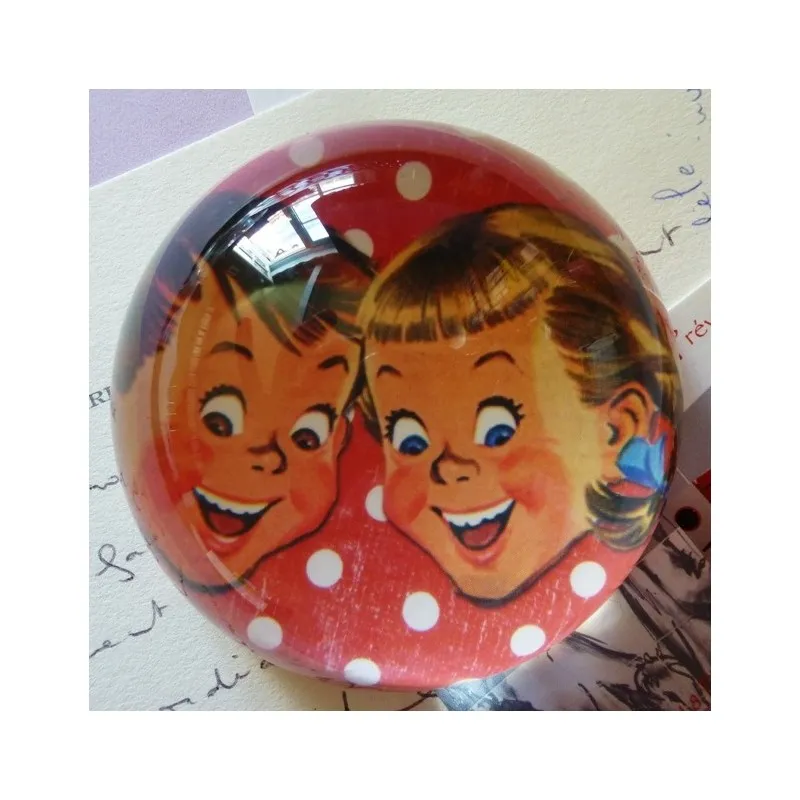 Presse papiers vintage à poser sur comptoir de cuisine ou sur un bureau. Demie-boule en résine transparente, pour l’illustration fille et garçon des années 50 sur un fond rouge à pois blancs. L’accessoire de bureau indispensable pour tous ceux qui aiment les boules à neige.