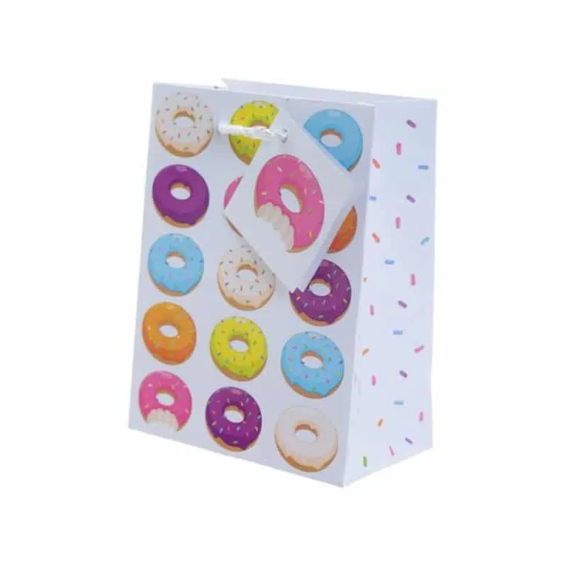 Petit sac qui fait office d’emballage cadeau. Pochette cadeau blanche avec des donuts multicolores qui le rendent festif. Pour le côté pratique il y a des anses lacets.