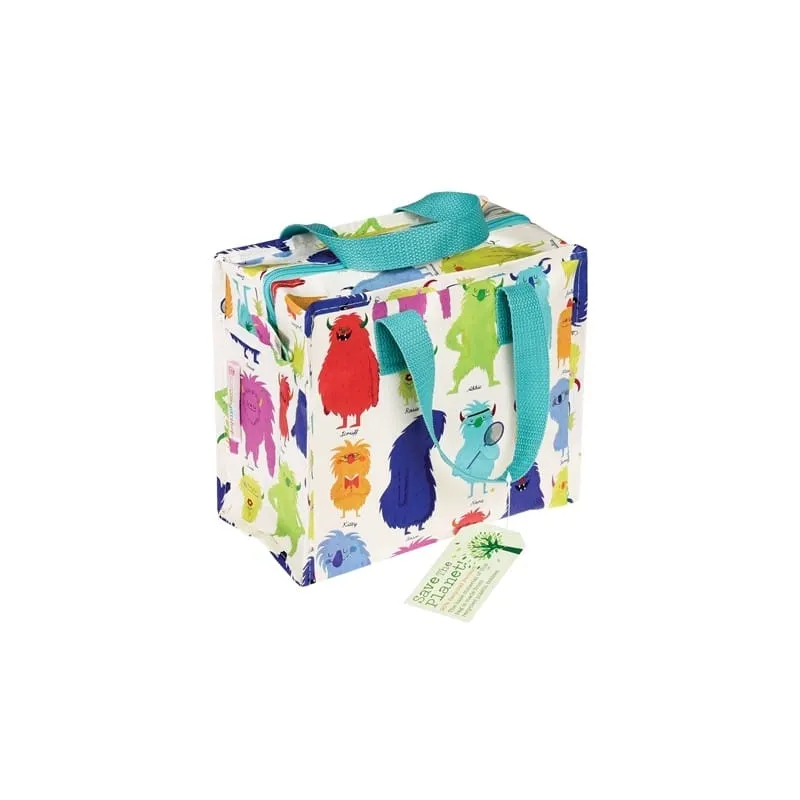 Sac monstres rigolos pour enfant, avec zip, poignées en nylon bleu pour ranger petits jouets ou emmener son goûter ou pique-nique.