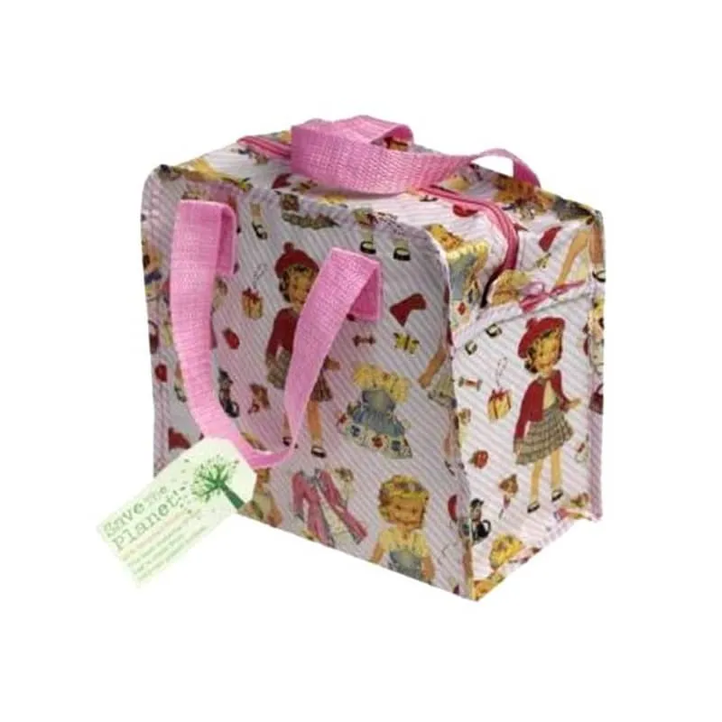 Un petit cabas au look vintage pour les enfants. Sac en plastique avec un soufflet, une fermeture éclair et des poignées. Un sac pour transporter ses chaussons ou ses affaires de poupée quand on va passer l’après-midi chez une copine.
