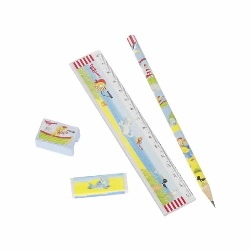 Un set de papeterie pour que les explorateurs des mers puissent noter leurs aventures : crayon, taille crayon, gomme et règle.