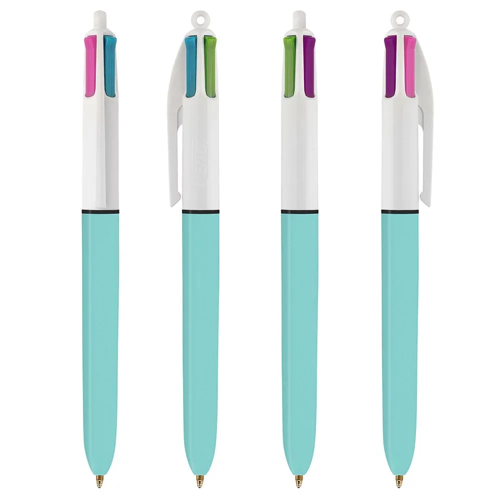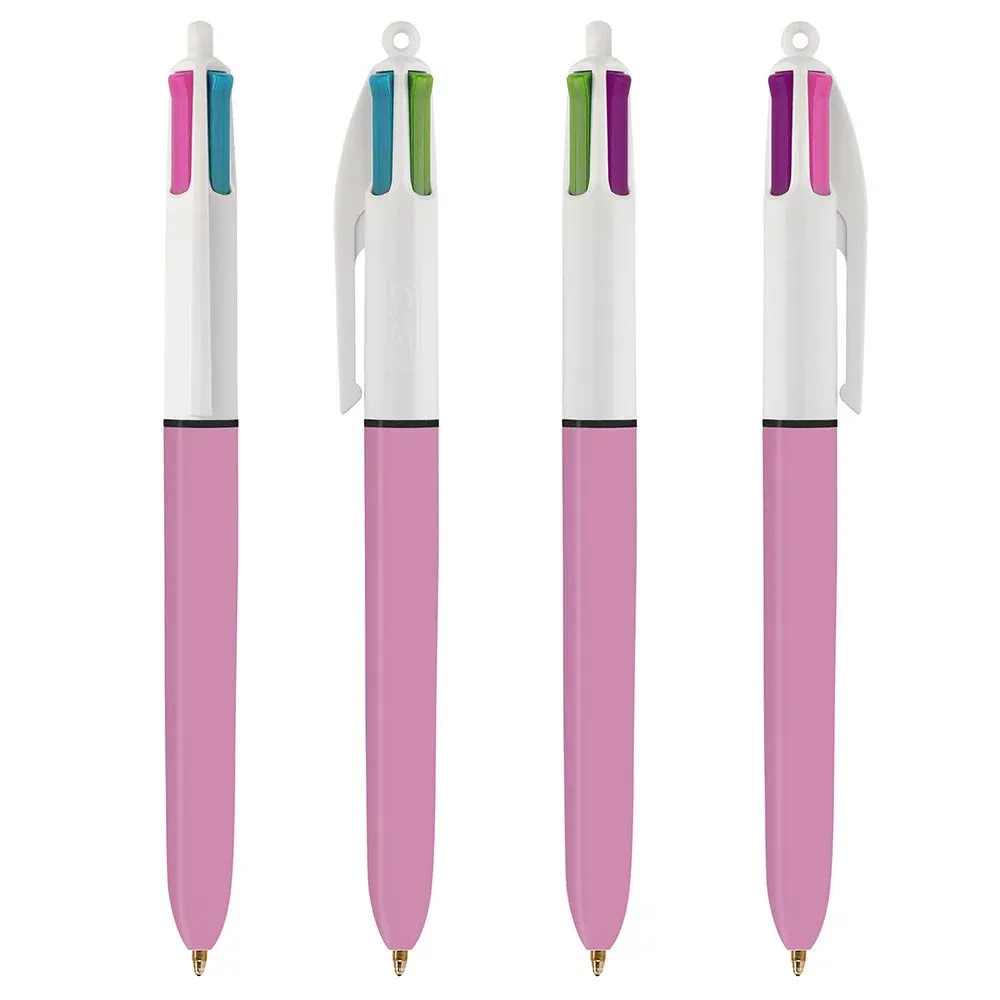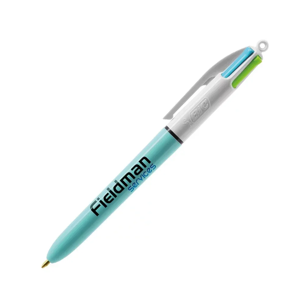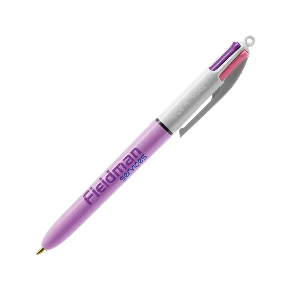 Stylo BIC 4 couleurs Fashion personnalisable Made in France. La version moderne du stylo-bille le plus emblématique se décline en quatre couleurs actuelles : turquoise, vert acide, violet profond et rose bonbon.