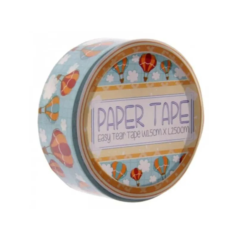 Sur un fond bleu s’envolent des montgolfières. Ruban adhésif pour tous les loisirs créatifs.