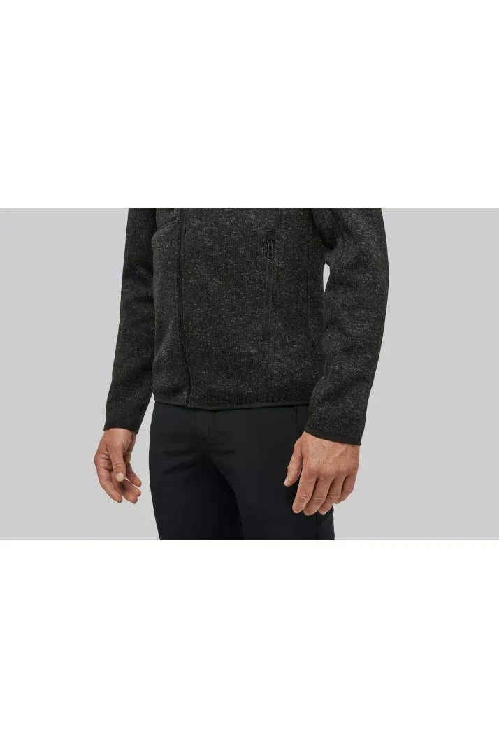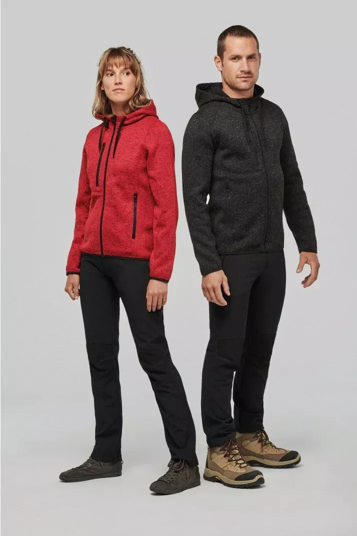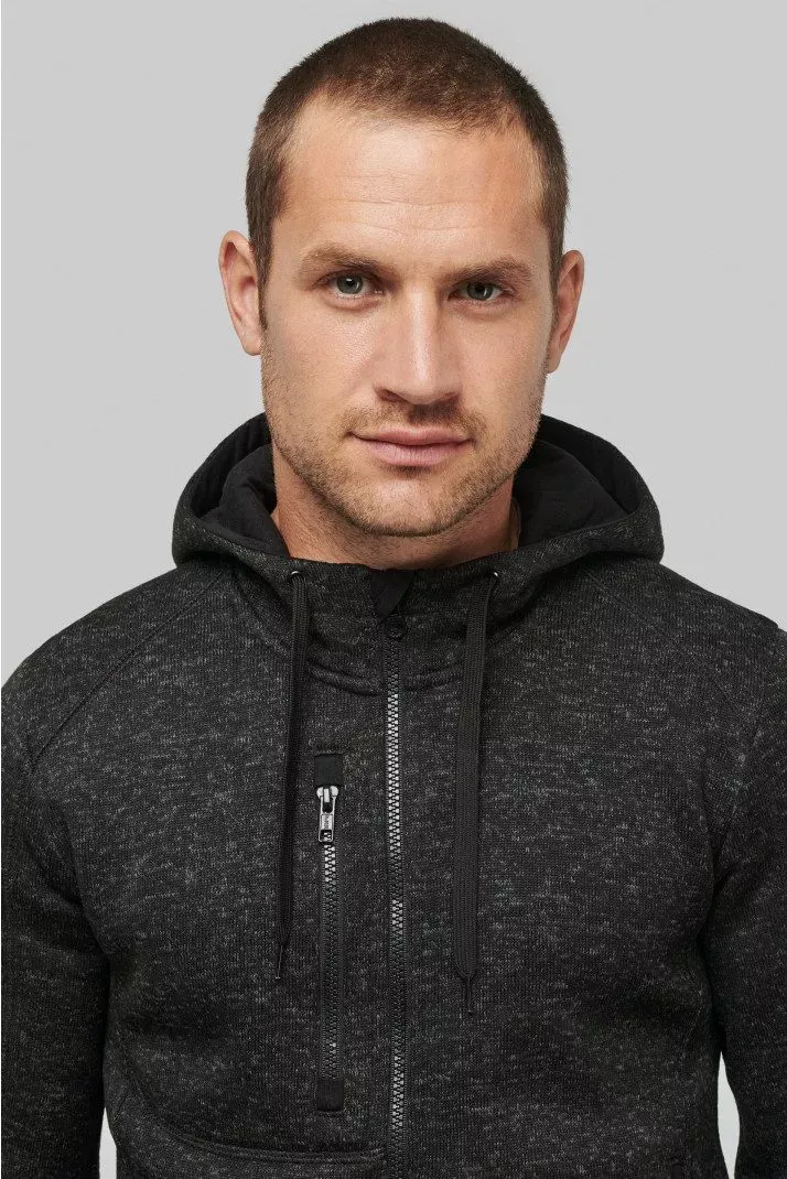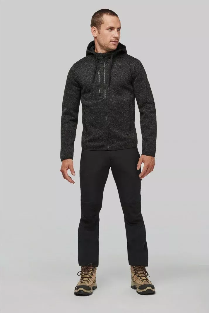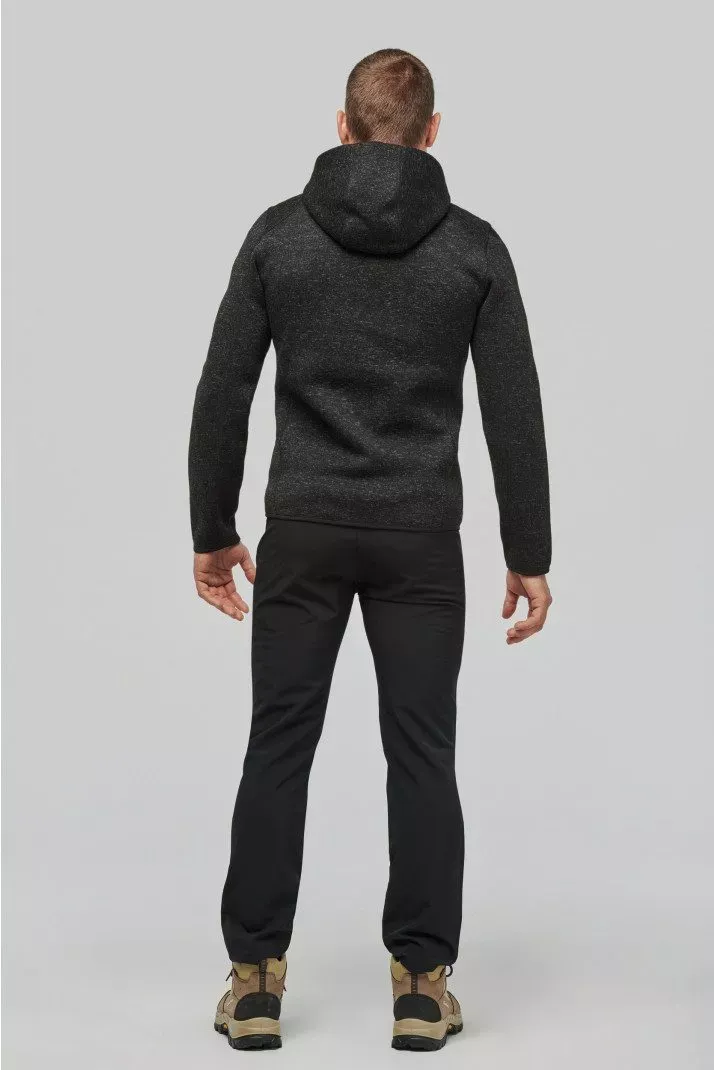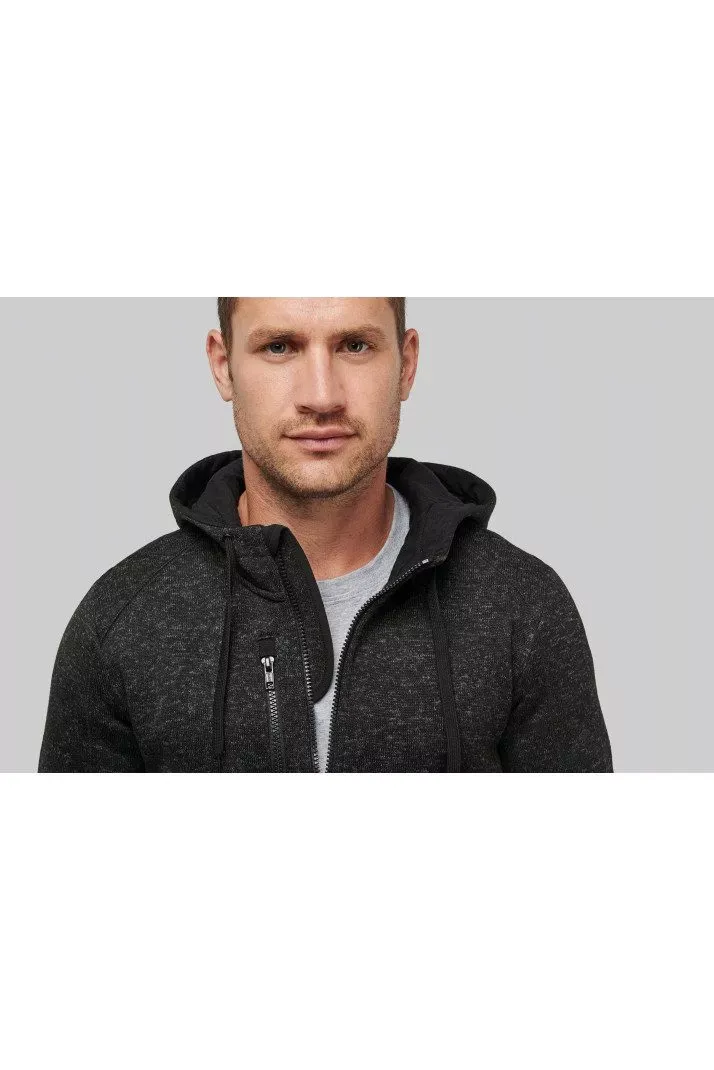 Veste à capuche chinée certifiée Oeko-Tex en tricot intérieur gratté 100% polyester pour plus de résistance et de confort.