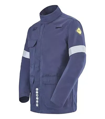 Cette Veste multirisques bleu marine a un devant fermé par fermeture à glissière sous patte maintenue par des pressions cachées.